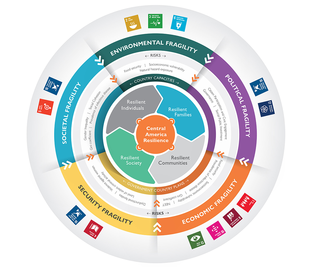 Building resilience requires the identification of complex risks. El Salvador, Guatemala, and Honduras face a constellation of compounding crises that have pushed development and humanitarian aid efforts to focus on meeting immediate needs through service delivery and economic opportunities. However, this needs-based approach has mostly failed to address complex risks and crises as well as their root causes, necessitating a new development and humanitarian approach that focuses on resilience. A resilience approach that identifies complex risks and causes and works to strengthen the absorptive, adaptive, and transformative capacities within societies is essential to helping the region move beyond current fragility traps. World Vision’s “Hope at Home: Building Resilience in Central America” framework helps to identify major multidimensional risks and vulnerabilities that have been shown to make people vulnerable to forced migration as a negative coping mechanism.25